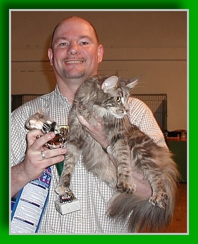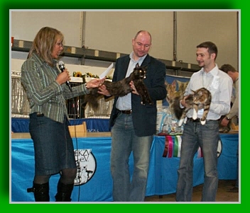 Katzenausstellungen sind immer ein Punkt, der gerne kontrovers diskutiert wird. Anscheinend gibt es nur „Aussteller“ und „Nicht-Aussteller“.Und keine Brücke dazwischen. Und trotzdem hier ein paar Worte dazu: Zuchtanfänger entscheiden oft lediglich zwischen „gefällt mir“ und „gefällt mir nicht“ wissen aber nicht, warum. Sie haben oft noch kein Auge für die gewissen Merkmale und wie diese bei einer typvollen Maine Coon aussehen sollten. Man kann manchen Leuten zehn Fotos von Maine Coons zeigen - und dabei ist dreimal eine Extremtyp-Katze: zwei Mal hört man "igitt" und einmal "oh ein Traum“! Das mit dem Typ lernt man schon als Anfänger verhältnismäßig schnell. Aber zwischen bewusster Beurteilung der Katze und einem "Look" nachrennen ohne zu wissen was es eigentlich ist, was einem daran gefällt, ist nochmal ein Unterschied. Und vor allem dann noch zu überlegen was phänotypisch, also optisch, nun zu der eigenen Katze passt. Und dann weiss man natürlich als Anfänger auch noch nicht, wie man den geschriebenen Standard an der Katze interpretiert beziehungsweise wie das denn nun in der Praxis aussehen soll, was da so schön geschrieben steht. Auch erwähnen muss ich, dass es für die meisten Katzen keineswegs eine Qual ist, auf einer Ausstellung zu sein. Wenn eine unserer Katzen das nicht mag, dann muss sie auch nicht – zumindest dann, wenn sie die Mindestanforderung, die ich an ein Zuchttier stelle, also von drei verschiedenen Richtern auf drei Ausstellungen begutachtet zu werden und den Champion-Titel zu bekommen - erfüllt. Damit habe ich dann auch gleich einen Einblick in das Wesen meiner zukünftigen Zuchtkatze bekommen: ist sie eher ängstlich, lässig cool oder liebt sie den Trubel.. – ich gestehe, eine schüchterne Kätzin würd ich genauso wenig gerne in der Zucht haben wie eine dem Standard nicht Entsprechende. Dass Katz gesund sein muss ist ja eh klar. Aber eine Katze die agressiv oder ängstlich wird auf einer Show gehört da nicht hin -und meiner Meinung nach nicht unbedingt in eine Zucht. Die Bewertungskriterien für die Katzen sind in den Standards ( so quasi dem niedergeschriebenen Idealbild ) festgelegt. Je höher der erstrebte Titel für eine Katze ist, umso näher muss sie dem Idealbild kommen. Die Höchstpunktzahl im festgelegten Rassestandard liegt bei jeweils 100 Punkten, die sich allerdings je nach Rasse unterschiedlich aufteilen. Eine Katze kann nach Erreichen eines bestimmten Titels nur in der nächst höheren Ausstellungsklasse gezeigt werden. Also ein Champion muss als nächstes um den Titel Internationaler Champion starten und so fort... Grundsätzlich muss manzwischen dem "Traditionellen" und dem "Ringrichten" unterscheiden:.